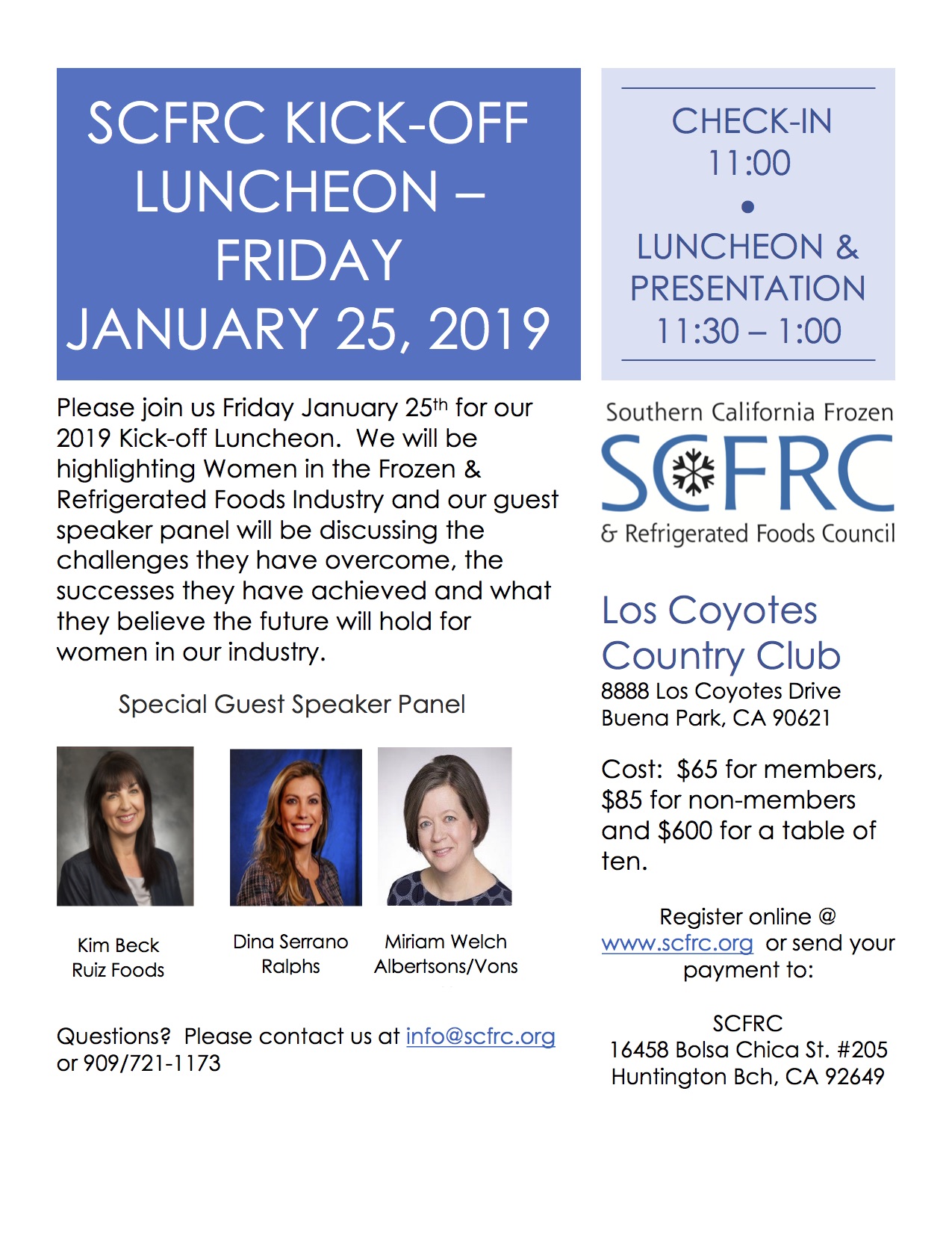 Please join us for our 2019 Kick-off Luncheon. We will be highlighting Women in the Frozen & Refrigerated Foods Industry. Our special guest speakers, Kim Ruiz Beck with Ruiz Foods, Dina Serrano with Ralphs and Miriam Welch with Albertsons will be discussing the successes and challenges they have experienced and the future of women in the frozen and refrigerated foods industry.